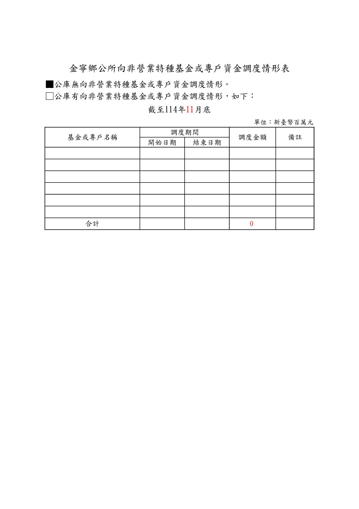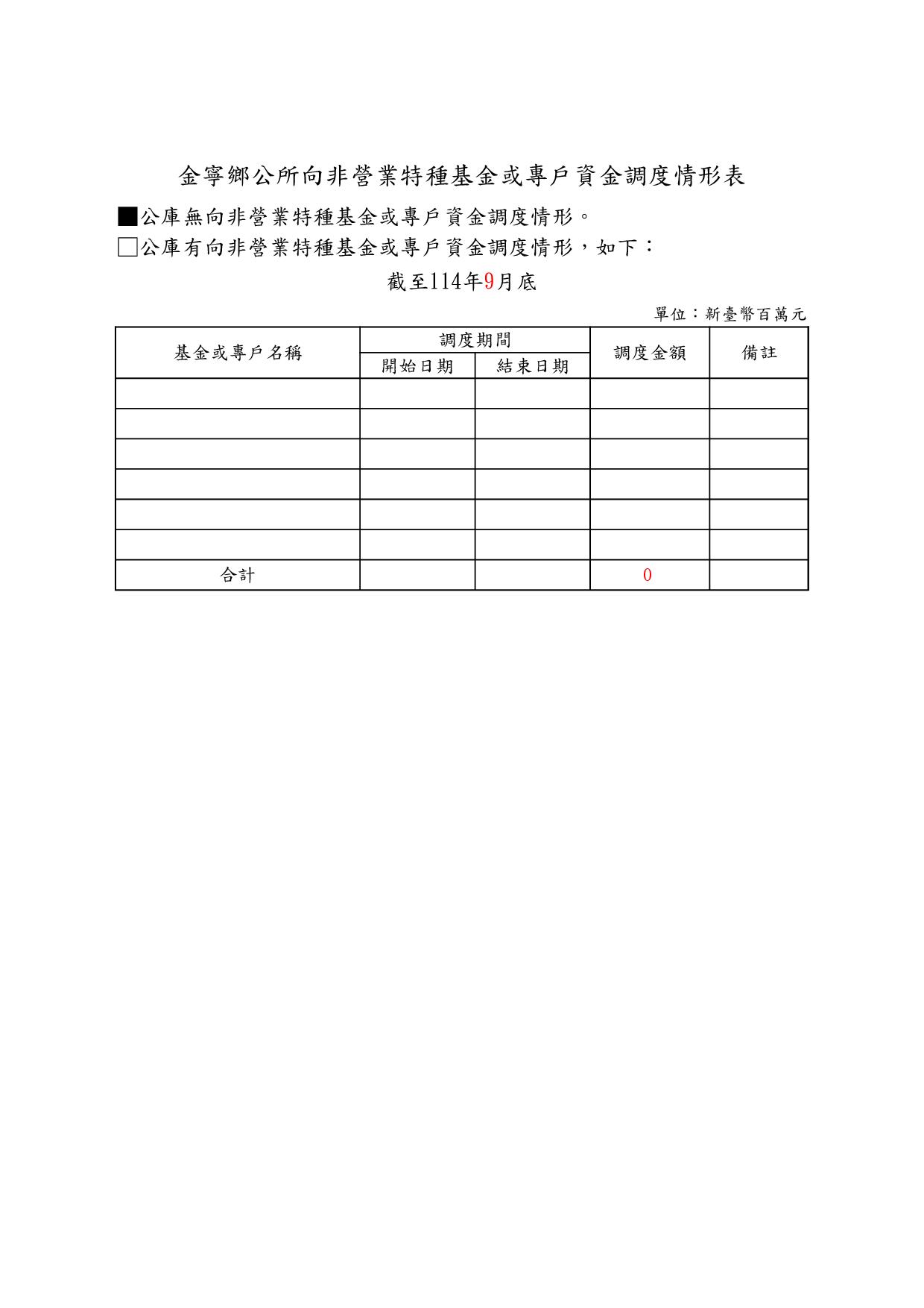 金寧鄉公所向非營業特種基金或專戶資金調度情形表